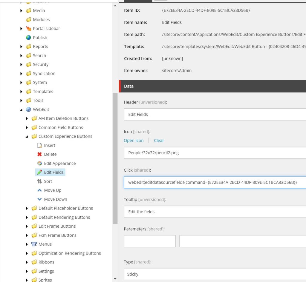 Last but not least we add the Edit Fields button in the core database under /sitecore/content/Applications/WebEdit/Custom Experience Buttons.