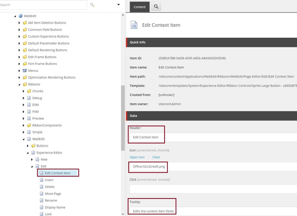 Now, when we open the Experience Editor we can see our new button and edit all fields for the context item.