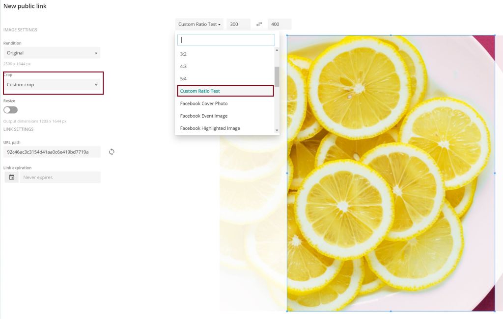 Now you can go back to your image, create the public link with custom crop und choose your custom ratio.
