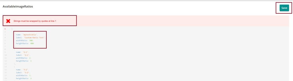Copy the JSON to the editor you want and add your custom ratios in the same format as the given ones. Put your new JSON to the edit area. Don’t be afraid about the error message you get immediately, just click Save.