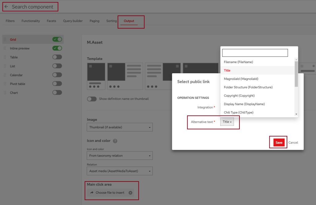 Click on the Search component and go to the tab “Output”. Scroll down and click “Choose file to insert” in “Main click area”. In the popup choose the property you want to configure for the Alternative text and click Save.