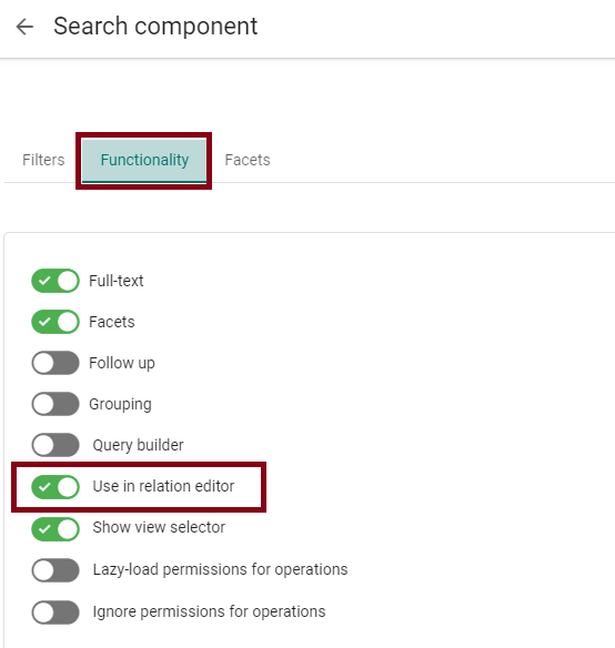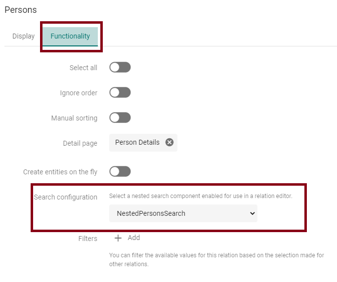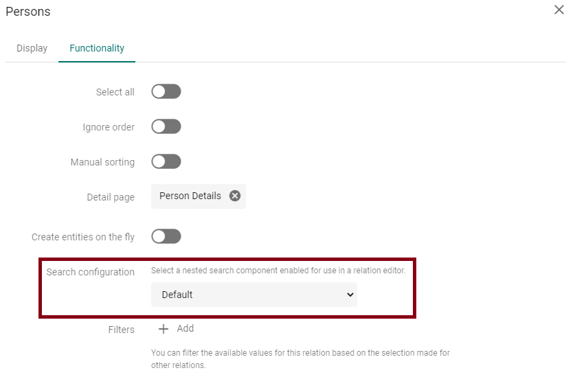 Click on the wheel next to your relation field to open the details in a popup. If you go to the tab “Functionality” you can see the node “Search configuration”. It gives you the following hint: “Select a nested search component enabled for use in a relation editor”. And this is what we do.
