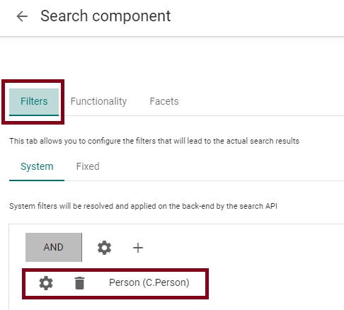 In Filters you choose your related entity, in my case it is “Person”. In tab Functionality it is most important to enable “Use in relation editor”. I also enabled Full-text and Facets. That’s why the third tab Facets appears. Here you can add any facet you want. I added just the “Person type”. (taxonomy field on entity Person). Now you have configured the search to use, save and close and go back to the Entity details component with the relation field display.