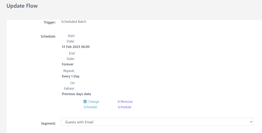 As you can see I selected everyday at 6am (This is always UTC), you can choose what fits your needs. Important: here you choose the segment you want to sync. I have a batch segment in place with all visitors who have an email address in Sitecore CDP. If you don’t have something similar in place create the segment and keep in mind that it takes some time to be built.