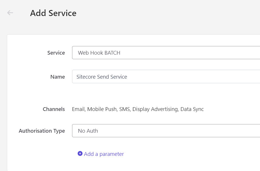 Choose e.g. Web Hook BATCH as “Service” and put in a name. For authentication choose “No Auth”. Save the service.