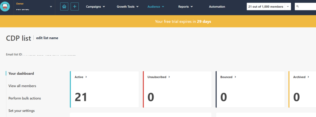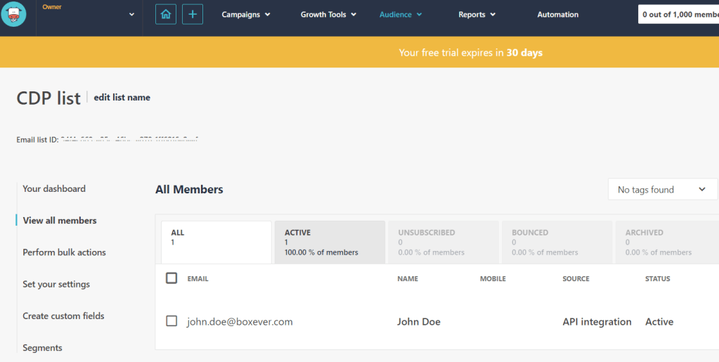 If you have no login to Sitecore Send you can easily register and test for free for 30 days. Go to https://moosend.com and register. After successfully logged in follow the steps to create a new mailing list. After creation it should look like this: